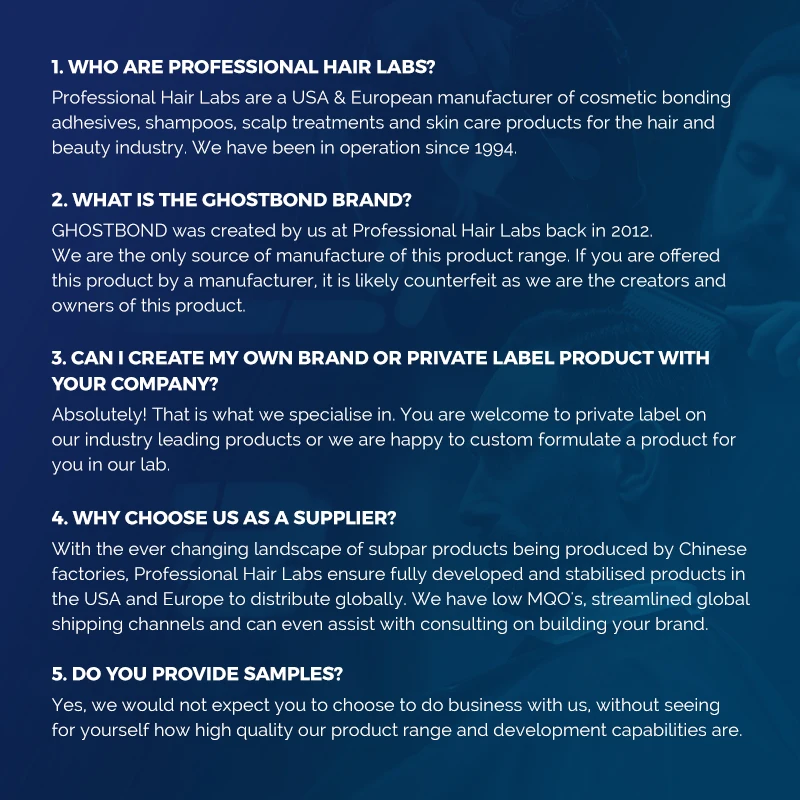 No business wants to spend its time or revenue placating unhappy customers when their products produce undesirable results, especially when those results are as embarrassing as an unattached wig or as uncomfortable as a chemical reaction. Many of the well-known brands stocked on salon shelves contain Hexane, Xylene and Toluene, chemical ingredients that have been proven to interfere with the natural PH balance of the skin and are often considered major health risks. With a clear "Safety First" motto, we believe that no-one should have to choose between a great hair day and the health of their skin. Our commitment to salon owners and their clients means that we will never introduce these harmful chemicals into our formulas.