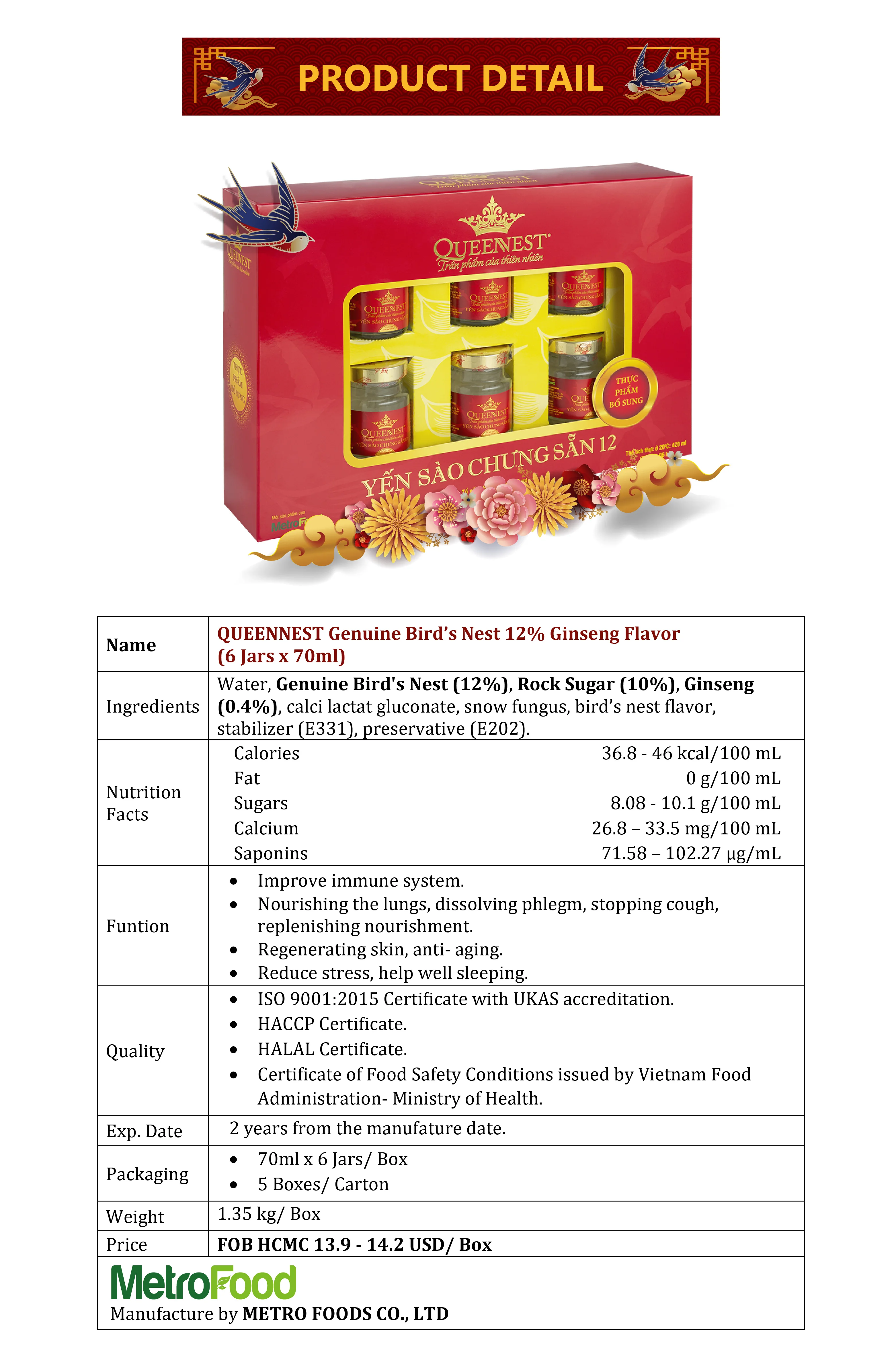 Ingredients | Water, Genuine Bird's Nest (12%), Rock Sugar (10%), Ginseng (0.4%), calci lactat gluconate, snow fungus, bird’s nest flavor, stabilizer (E331), preservative (E202). |