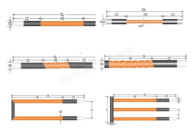 Inquiry | When you place an order of SiC heating elements, please give following information: OD: Outer Diameter; HZ: Length Of Hot Zone; CZ: Length Of Cold Zone; OL: Total Length | 2500 | 2000 | 2000 | 2000 | ||||
