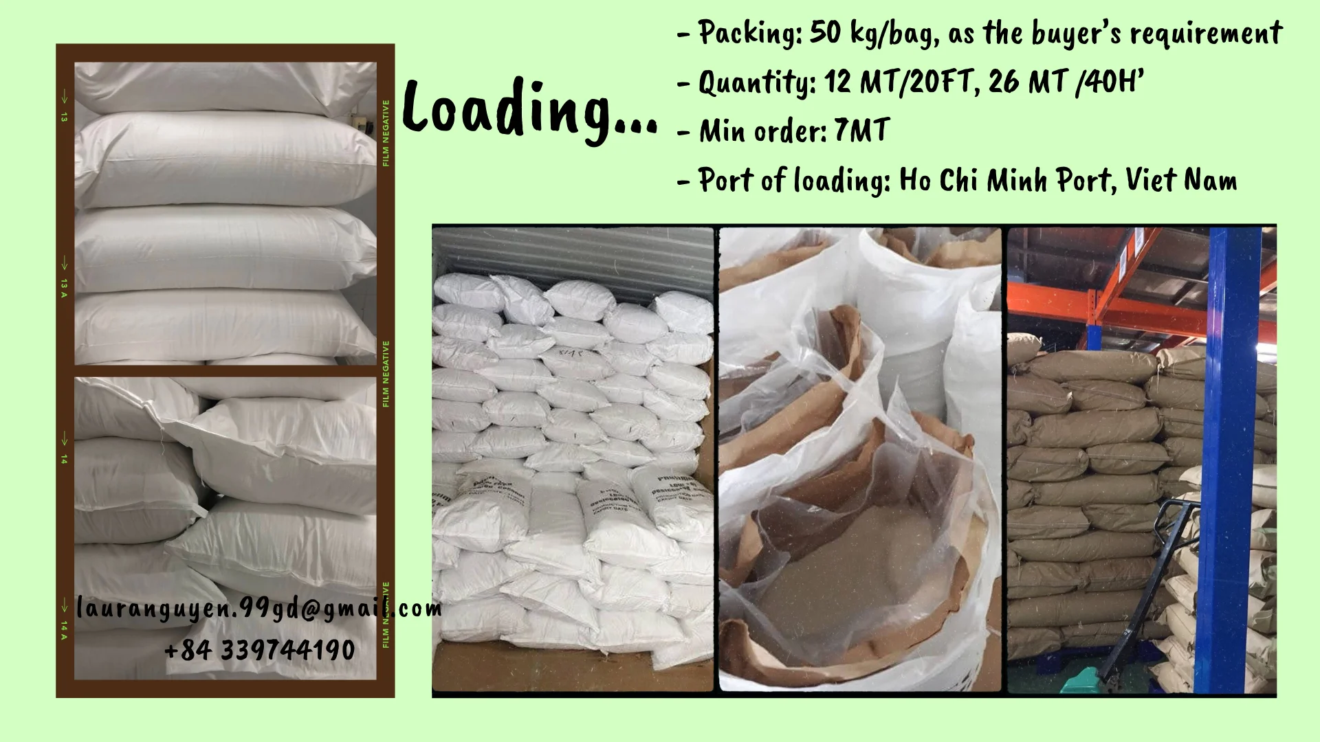 Loading | 12 MT/20FT, 26 MT /40H’ | 12 MT/20FT, 26 MT /40H’ | 7.2MT/20’HQ, 16 MT/40’HQ | ||