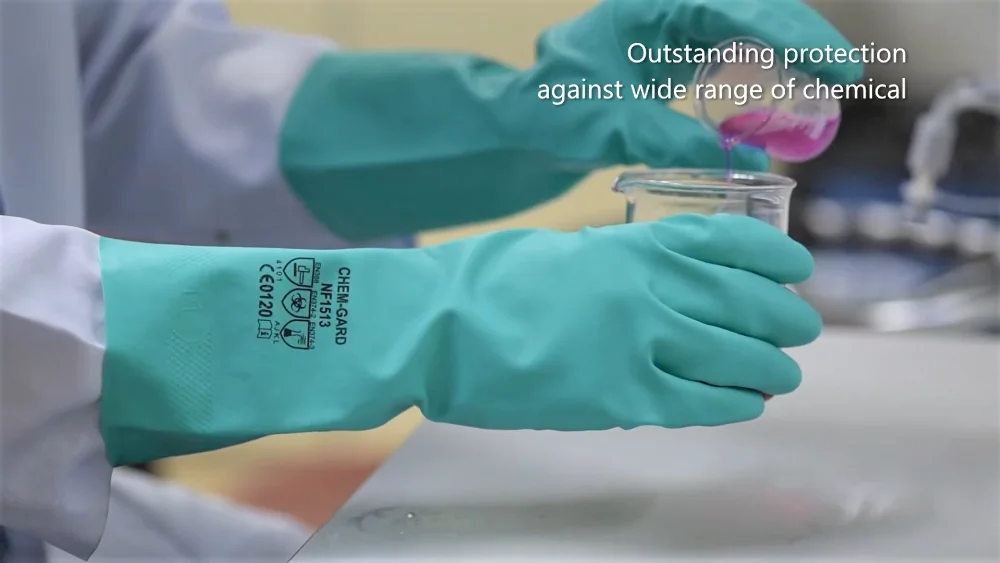 OEM direct factory flocklined non latex green nitrile gloves Malaysia for chemical resistant oil grease for car repair use