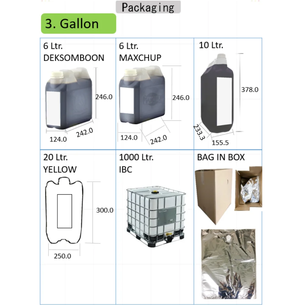 Sizes include 12x300ml., 12x700ml., 12x1000ml., 6x2000ml. Other packing sizes are available upon request.