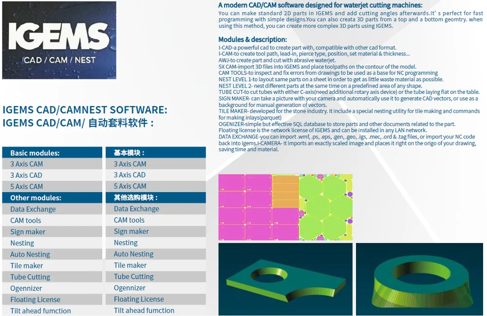 Control System Software (NC Studio): >Friendly control interface >Reliable and durable operation. >compatible with IGEMS CAD/CAM/NESTING software, extendable by module: tile parquet, tube cutting, camera sheet positioning, 3D toolpath generator. >Dynamic cutting speed/abrasive volume control >Z Axis piercing height Control >Follow cutting height by detector. >Follow cutting height by laser scanning system >Break Point Resume, Any point continue. >Cutting Time & Cost Evaluation. >Consumable lifetime Reminder >Multi-Origins >Revolve Program >Simu-mode On Office Computer >Auto-Error Diagnose >Backup-Restore software >Remote Assistant |