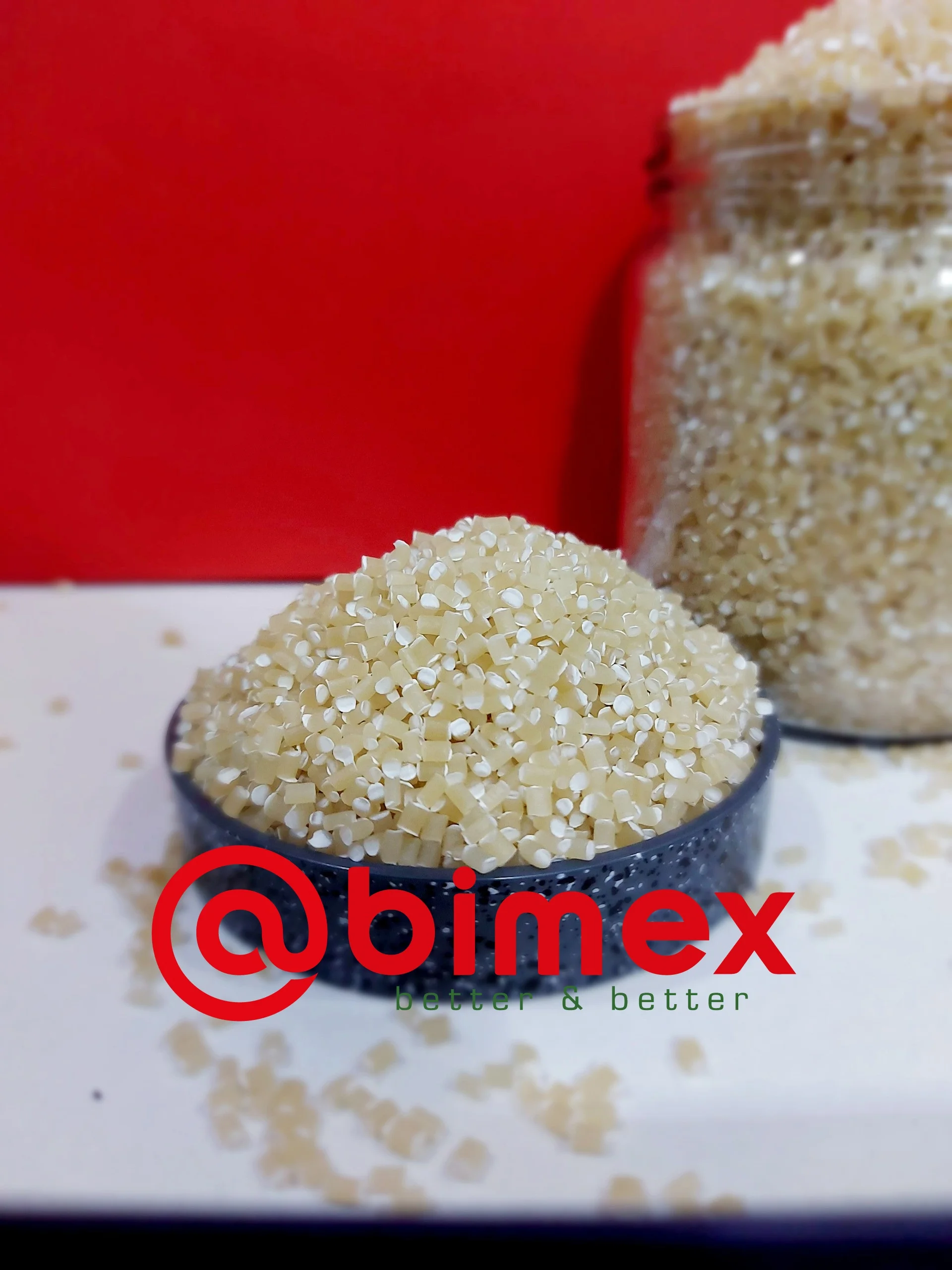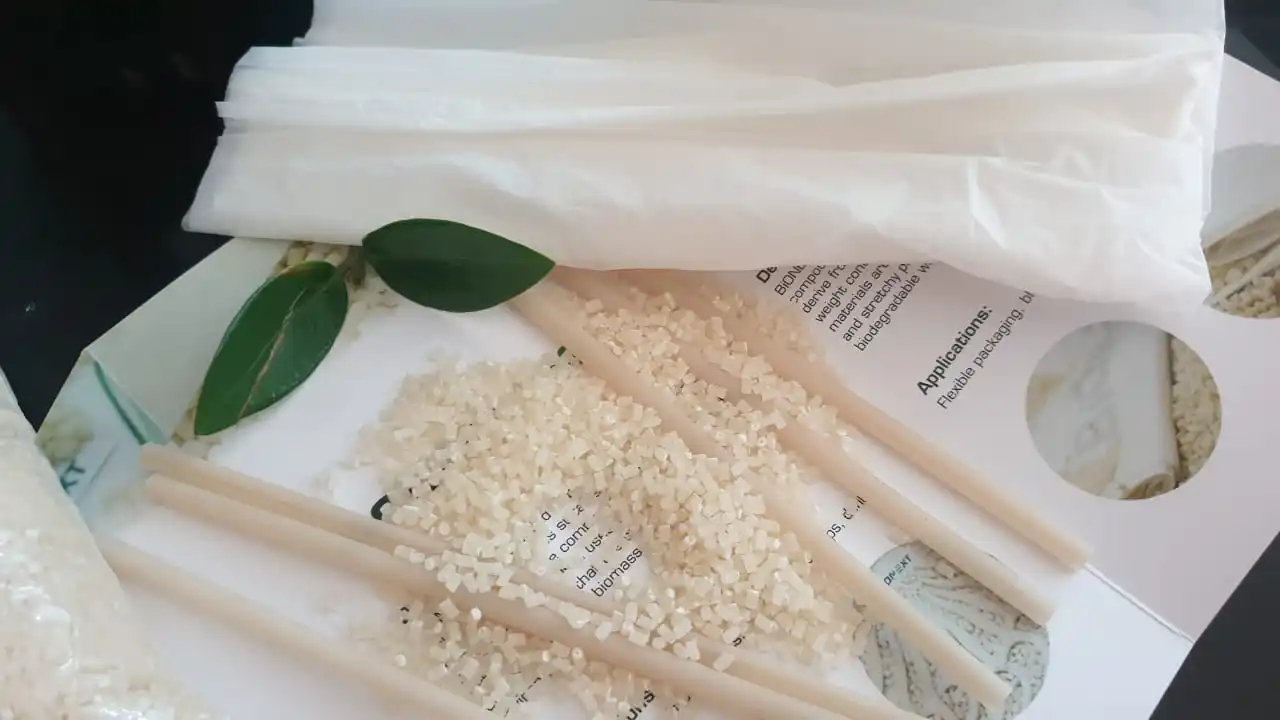 product is beige pellet, light smell of starch, no irritation and can be biodegraded into CO2 , water and biomass during at least 2 years in compost soil. Product’s properties are nearly the same of those of the conventional products from fossil polymers. Processability is stable in normal HDPE or LDPE blowing machine.