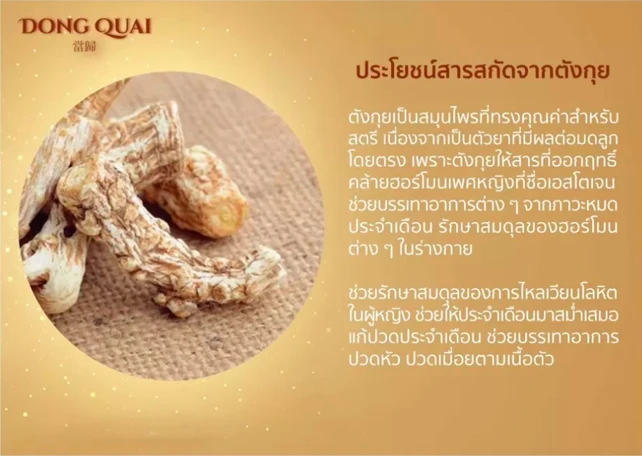Dong Quai Extract ✅ Dong Quai. 1 bottle contains 30 capsules, Queen Herbs, the inner story of women ✨ Results when taking Dong Quai Extract. ✅ Chinese herbal for women skin ✅ Helps keep the skin white, smooth and moist. ✅ Reduce the problem of freckles, whether it is blood blemishes Or hormonal melasma ✅ Reduce acne problems and acne rates ✅ Anti-oxidants, anti-aging ✅ firm breasts ✅ adjust the hormonal balance system ✅ Reduce the problem of menopause ✅ Add water to naturally lubricate Tang Kui The queen herb, famous for women, is a herb of China. That has medicinal properties and properties that are excellent for women in particular In the maintenance of the internal system of women comprehensively while also helping to maintain hormonal balance In the body and helps to enhance the effect of female hormones Make the body use the most beneficial hormones available. Dong quai is a natural alternative to female hormone replacement therapy and has been shown to reduce the side effects of menopause by 62%, such as fatigue, vaginal dryness, hot flashes. Insomnia and other symptoms, etc.