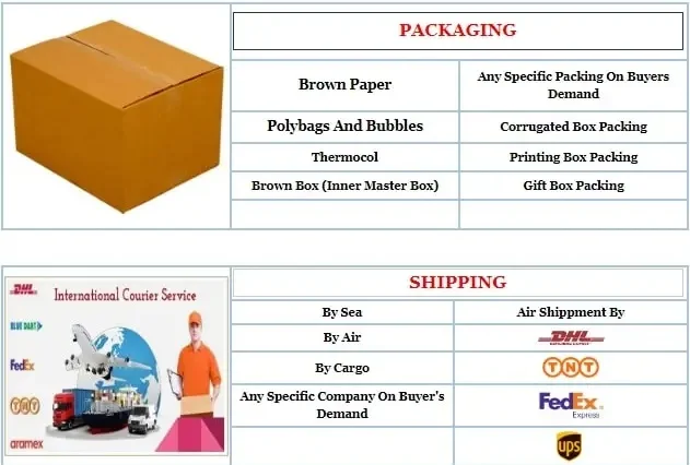 We are Providing Export Standard packing Which avoid damage of the product , or any type of Scratch Comes on the products . We also accept Custom Packing like Printing Box packing , Corrugated Box Packing , Display Packing etc