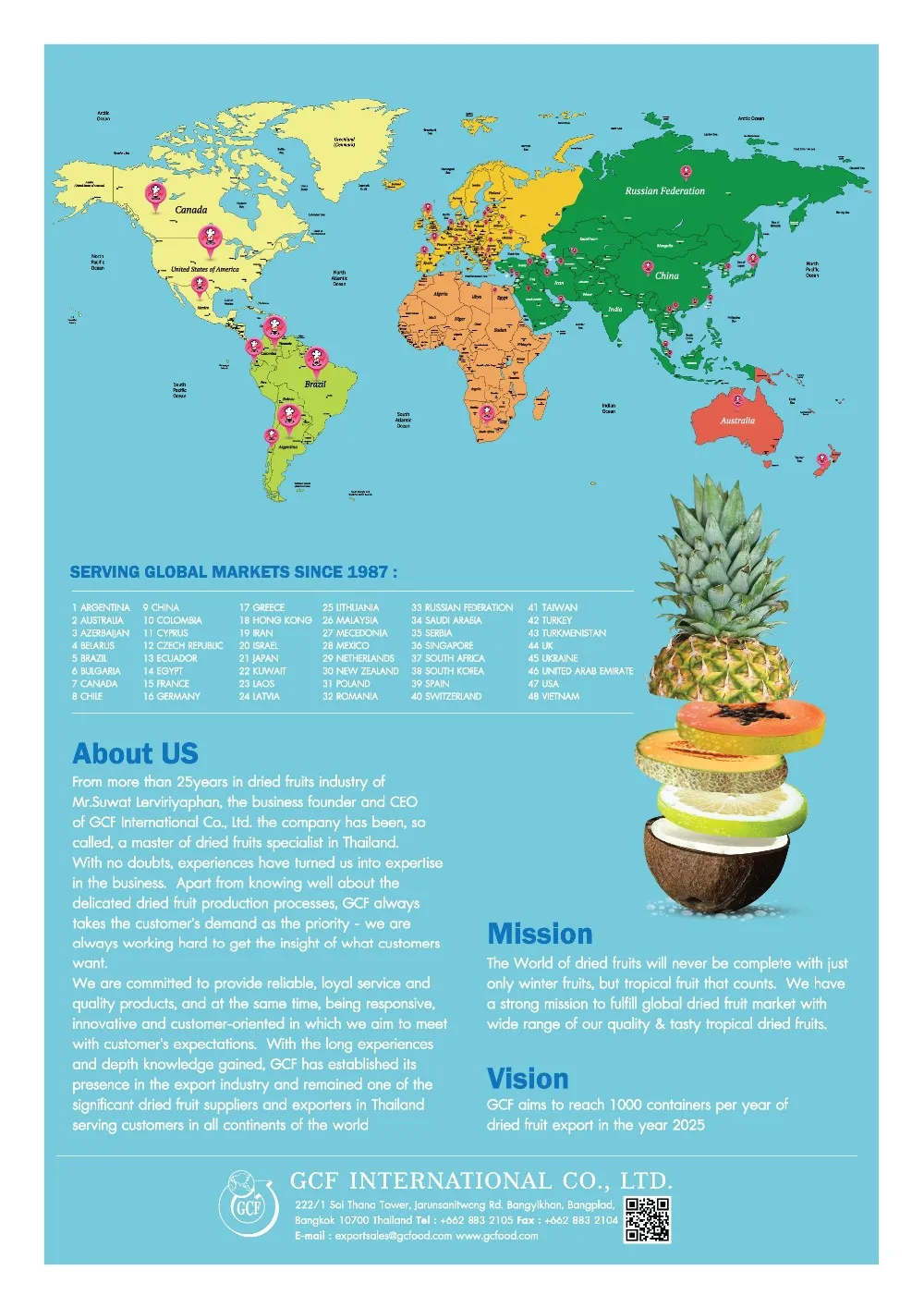 GCF International Co., Ltd. is a supplier & exporter of dried fruits and food ingredients based in Thailand. Established in 1987, for more than 30 years in dried fruit industry, GCF International has been so called, Thailand's Master of Dehydrated Fruits. With no doubts, experiences turned us into the expertise in the industry, mastering the delicate production process.