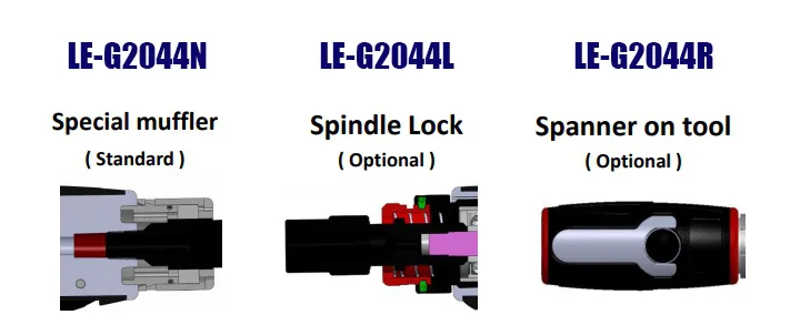 1.Unique Quick-Lock design locks the spindle in place with a push of a button 2.Requires only 1 wrench instead of 2 during attachment changes 3.Ergonomic curved body paying special attention to the comfort of the tiger's mouth when holding the tool 4.Spanner on tool for easy change. Save time and convenience, increasing work efficiency. 5. Porous decompression exhaust which can reduce noise and increase cylinder efficiency, thus reducing air consumption and air compressor power consumption. 6.Compact and lightweight.
