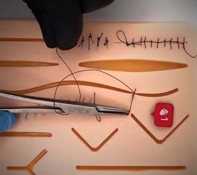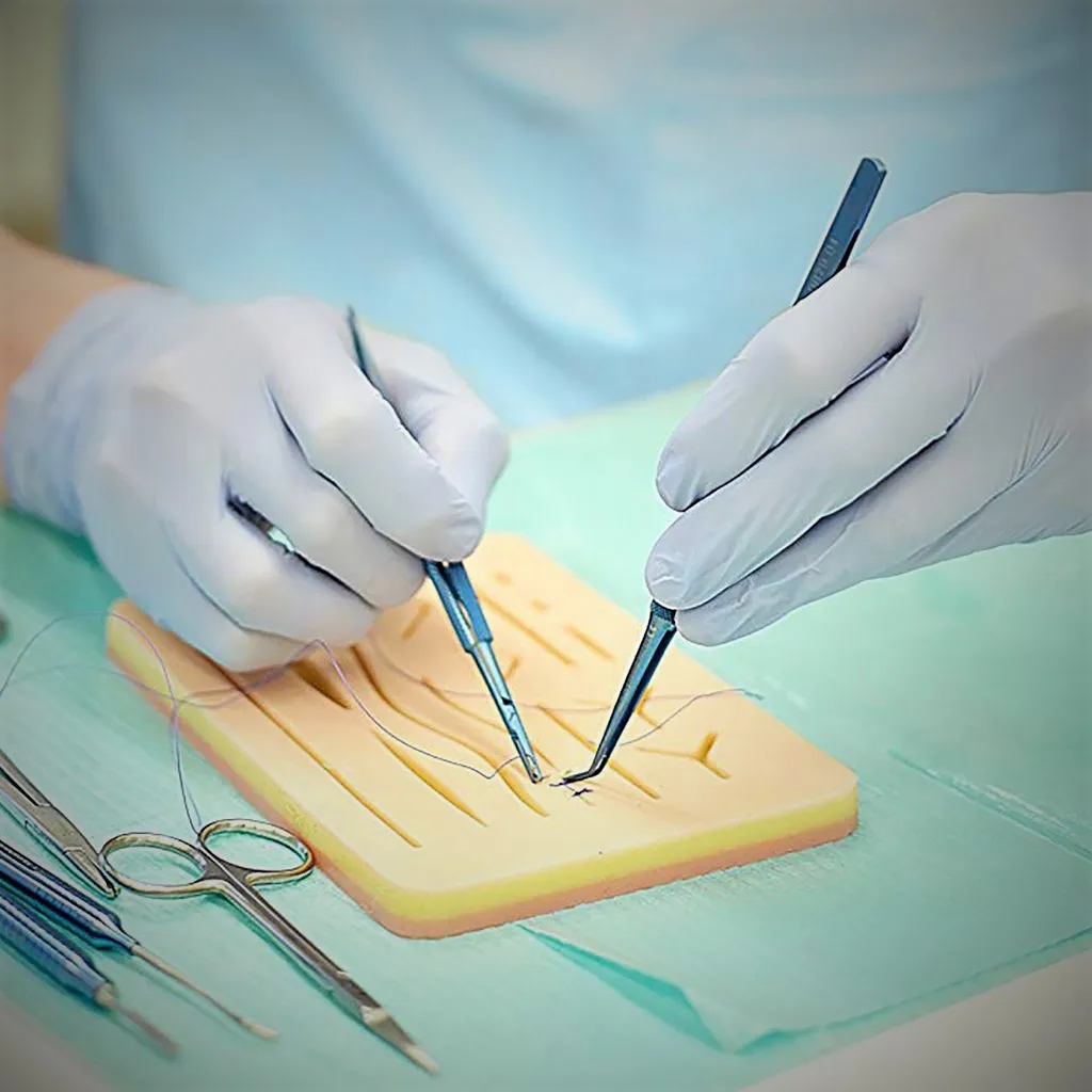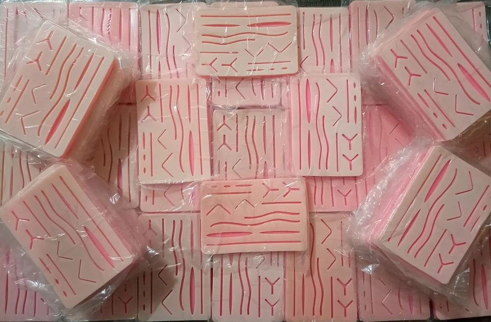 Suture Pads | 1x Suture Pad: Suture Pad Size: 7" x 5" Suture Pad Color: Human Lifelike Skin Thickness: 10mm Layers: 3 Layers (Skin, fat and muscle Simulation to human skin) Material: Silicone Composite Feature: 14 Pre Cut Wounds & Mesh under skin |
