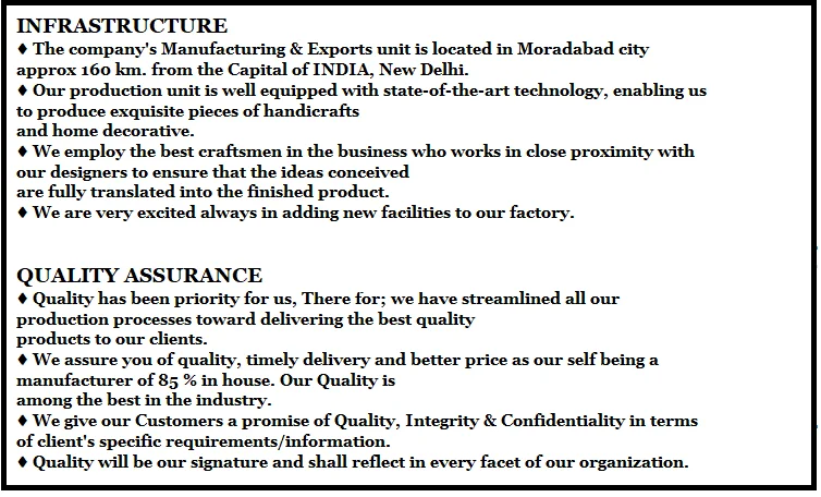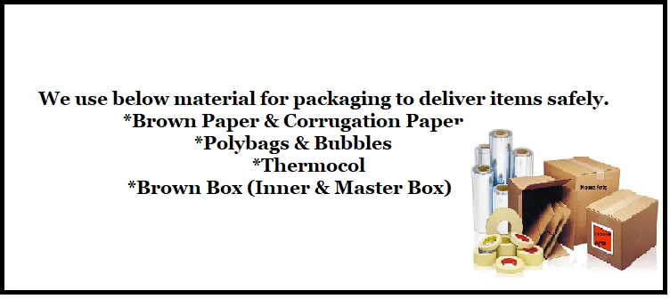Product Packing | We use below material for packaging to deliver items safely. *Brown Paper & Corrugation Paper *Polybags & Bubbles *Thermocol *Brown Box (Inner & Master Box) | |||