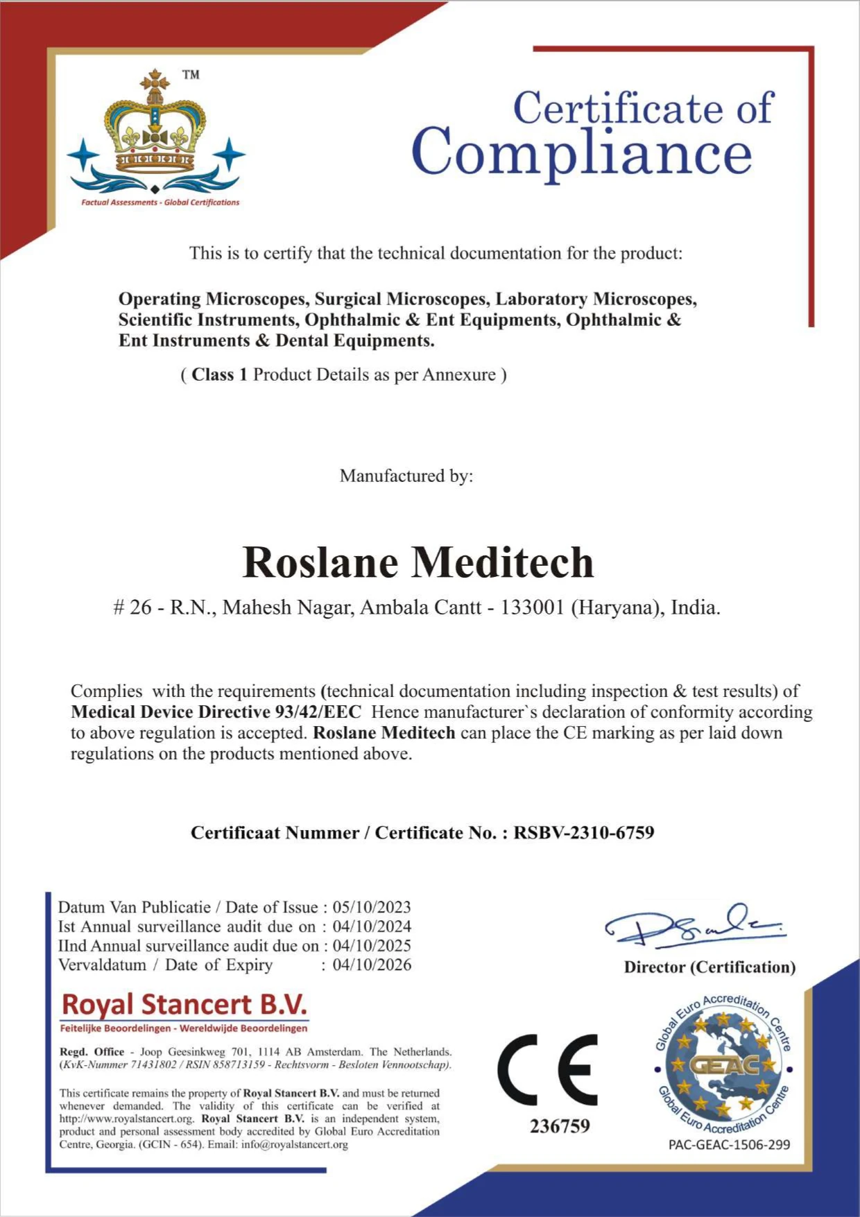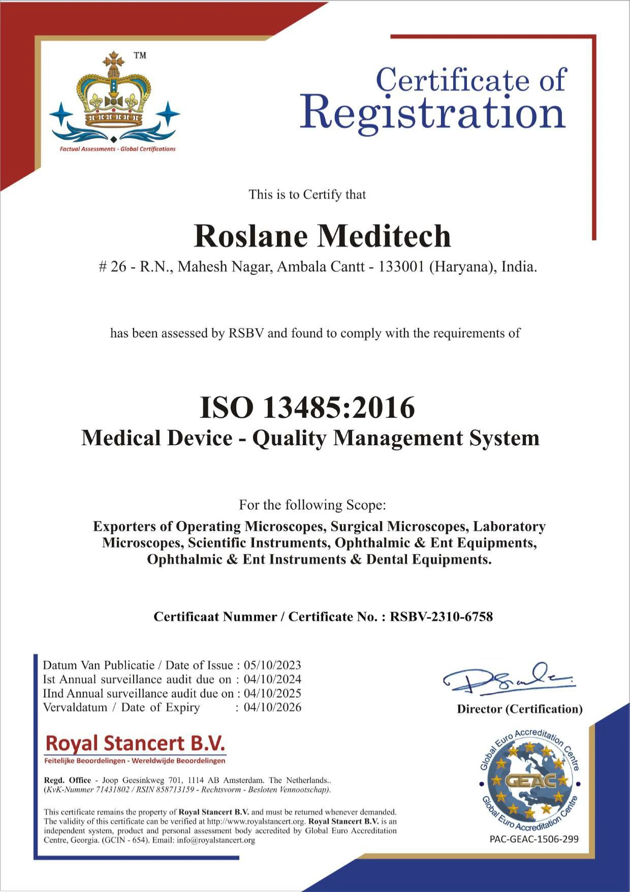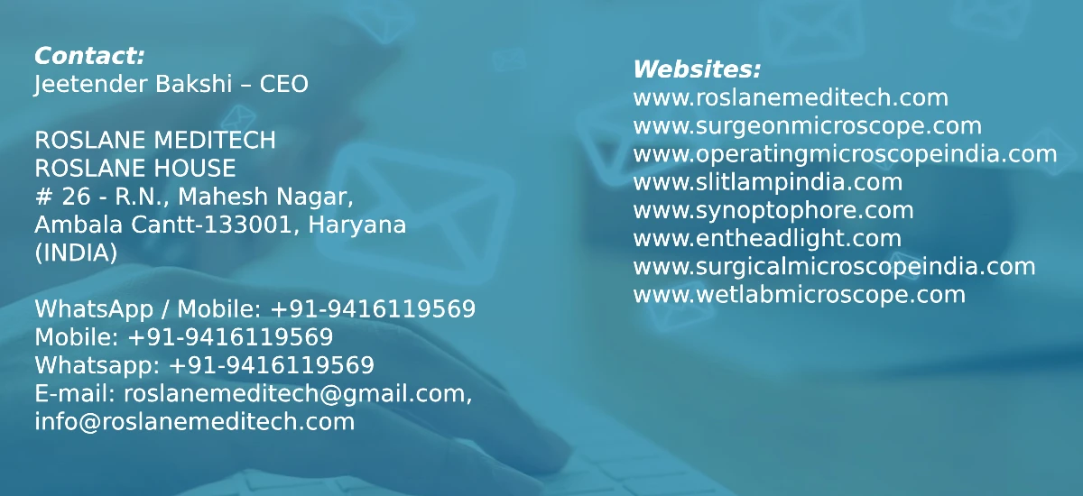 ROSLANE MEDITECH has a standing of over 17 years with proven track record in the business of exports of Operating Microscopes, Ophthalmic Equipments, ENT Equipments & Scientific Instruments. We are exporting to over 80 countries worldwide.