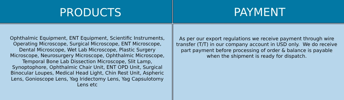Ophthalmic Equipment, ENT Equipment, Scientific Instruments, Operating Microscope, Surgical Microscope, ENT Microscope, Dental Microscope, Wet Lab Microscope, Plastic Surgery Microscope, Neurosurgery Microscope, Ophthalmic Microscope, Temporal Bone Lab Dissection Microscope, Slit Lamp, Synoptophore, Ophthalmic Chair Unit, ENT OPD Unit, Surgical Binocular Loupes, Medical Head Light, Chin Rest Unit, Aspheric Lens, Gonioscope Lens, Yag Iridectomy Lens, Yag Capsulotomy Lens etc