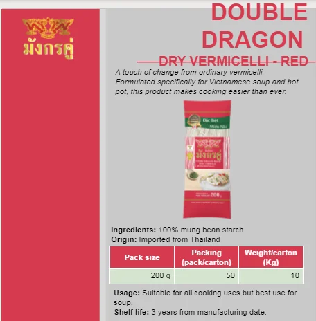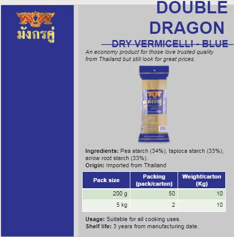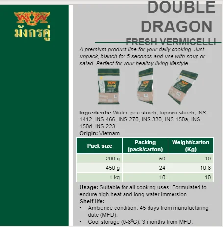 Net Weight | 200 g /pack x 50 packs per 10kg carton | Ingredients: | Water, pea starch, tapioca starch, INS 1412, INS 466, INS 270, INS 330... |