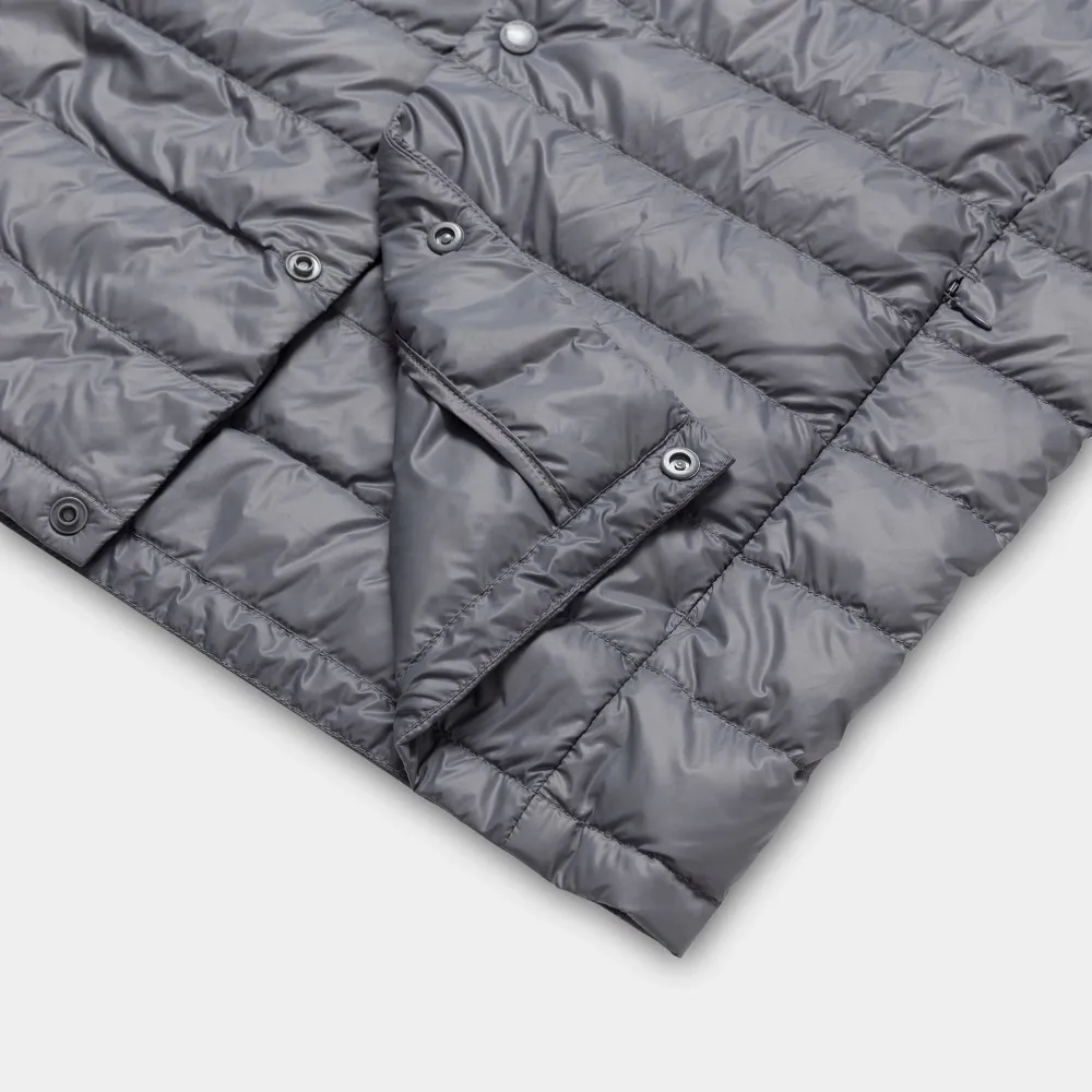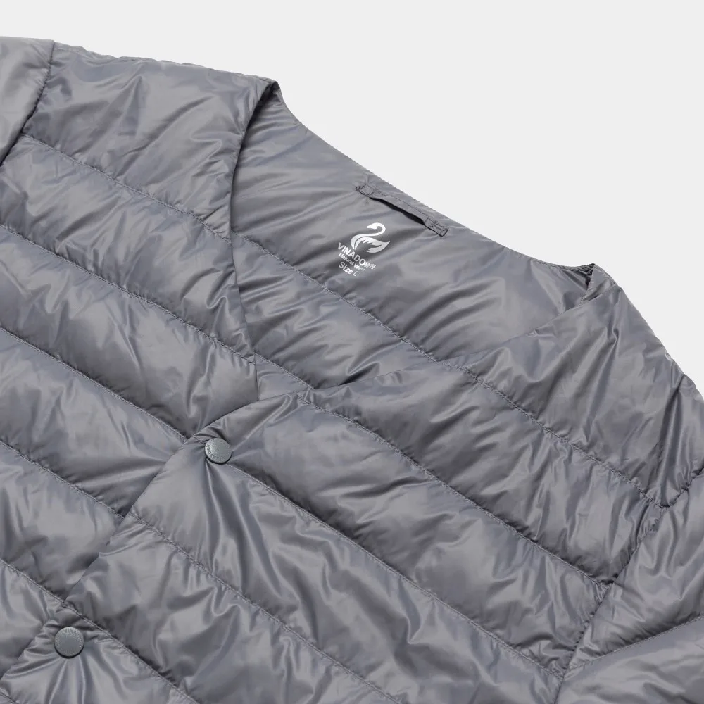 Advanced | 1. Designed V-neck, no stitching construction on the neck and front A thin, light, warm and windbreaking 2. Made with a durable water-repellent 3. Coating that keeps out light rain 4. Compact, pocketable design for easy carrying. 5. Out Fabric + linning: 100% Nylon, 6. Filling: White duck down 90/10 |