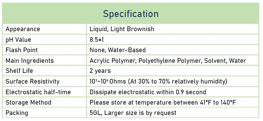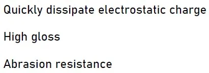 (1) Quickly dissipate electrostatic charge (2) Dry bright with high gloss (3) Abrasion resistance (4) Gentle odor and safe (5) Water-based formula