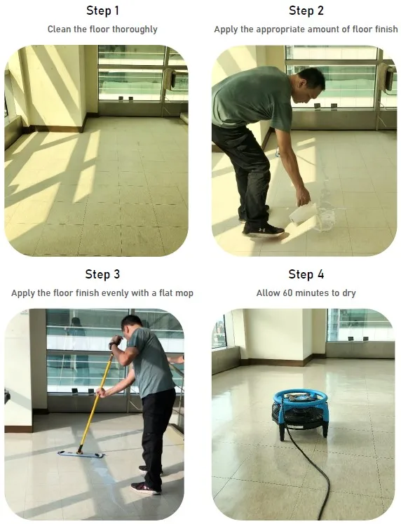 (1) Clean the floor and remove the wax with stripper - NS2 wax stripper is recommended. (2) After wetting and washing, use water to make sure there is no residue of wax remover. (3) Apply the Shock-Free Antistatic Floor Finish with flat mop. (4) Allow 1 to 2 hours to dry. The second layer can be applied in a completely dry place. (5) The waxed floor needs to be grounded to dissipate electrostatic swiftly.
