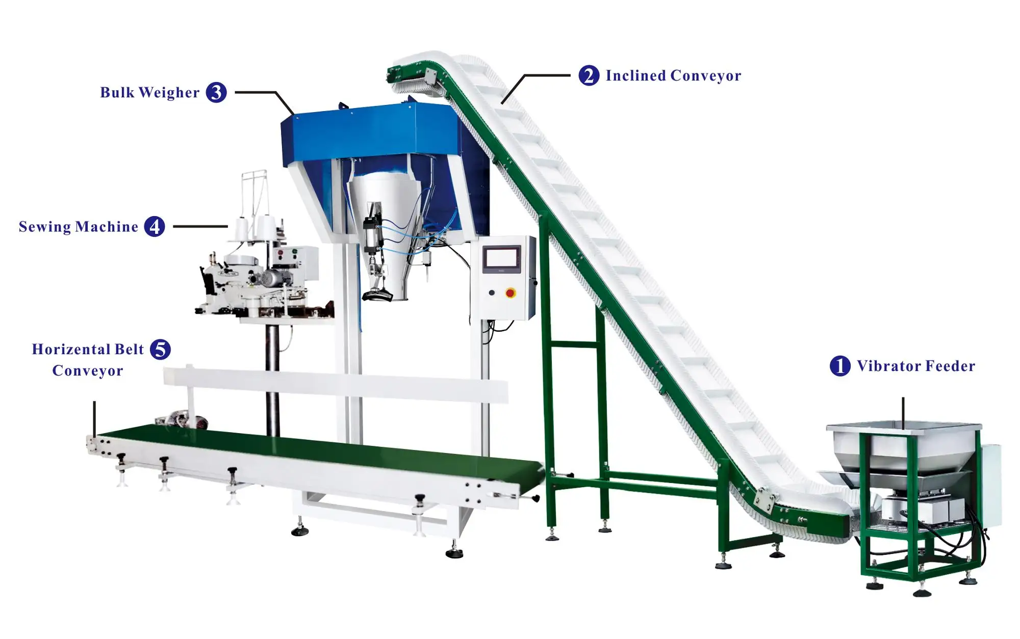 2. Fully-automatically completes all the process from feeding, weighing, sewing bags and finished products outputting;