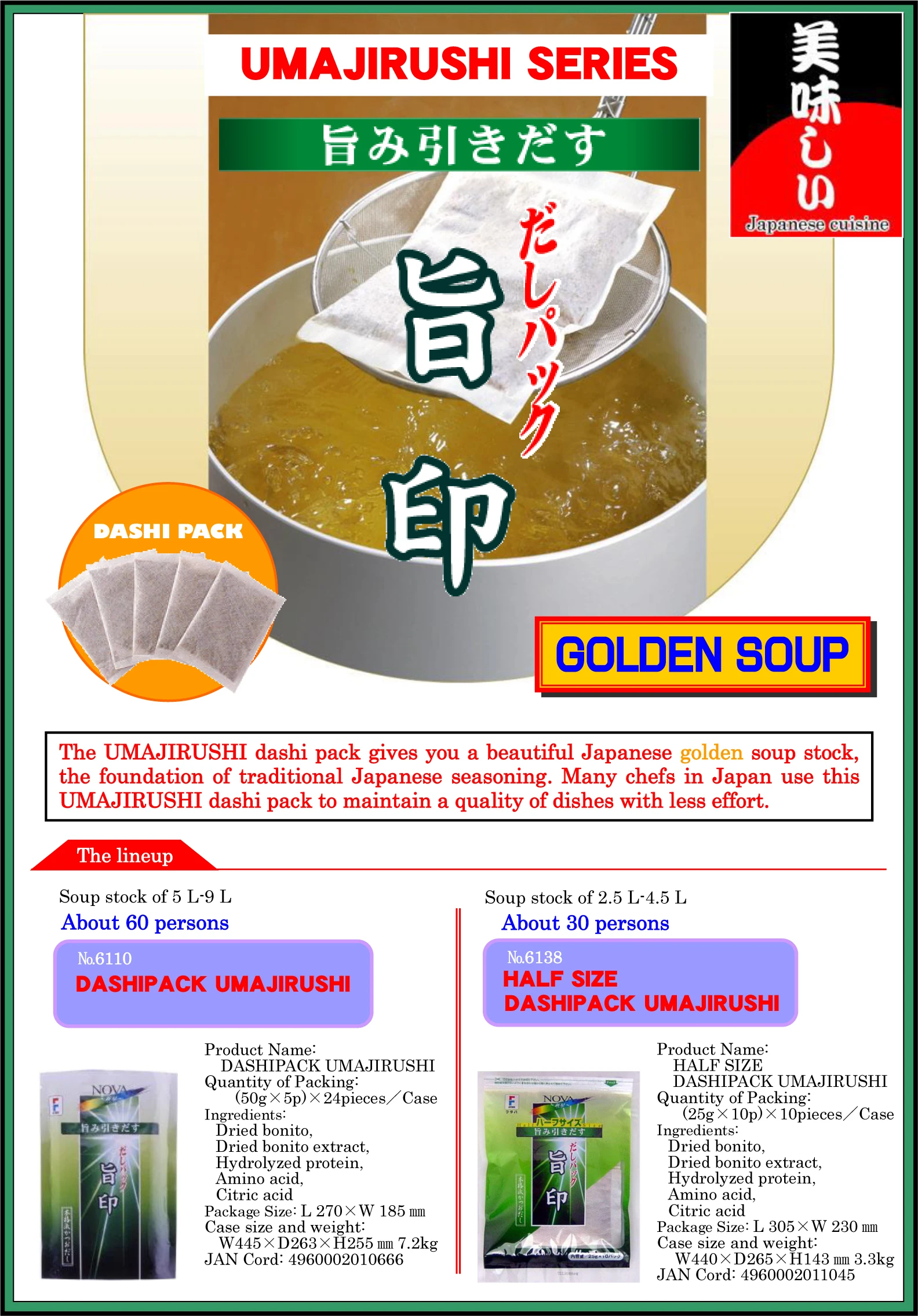 1.50g of UMAJIRUSHI dashi pack gives us up to 9 liter of soup stock. 2.Your cost will be 1/3 of using dried bonito flakes. 3.The UMAJIRUSHI dashi pack gives you a beautiful Japanese golden soup stock, the foundation of traditional Japanese seasoning.
