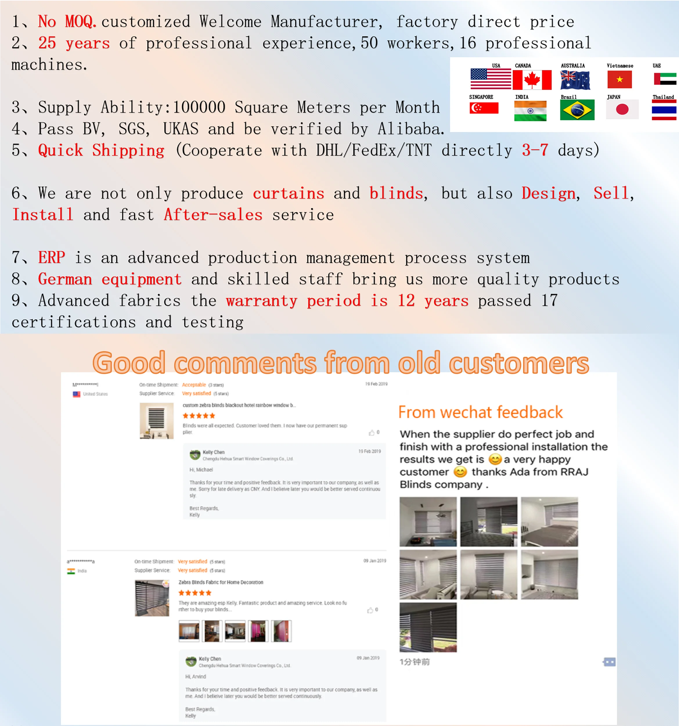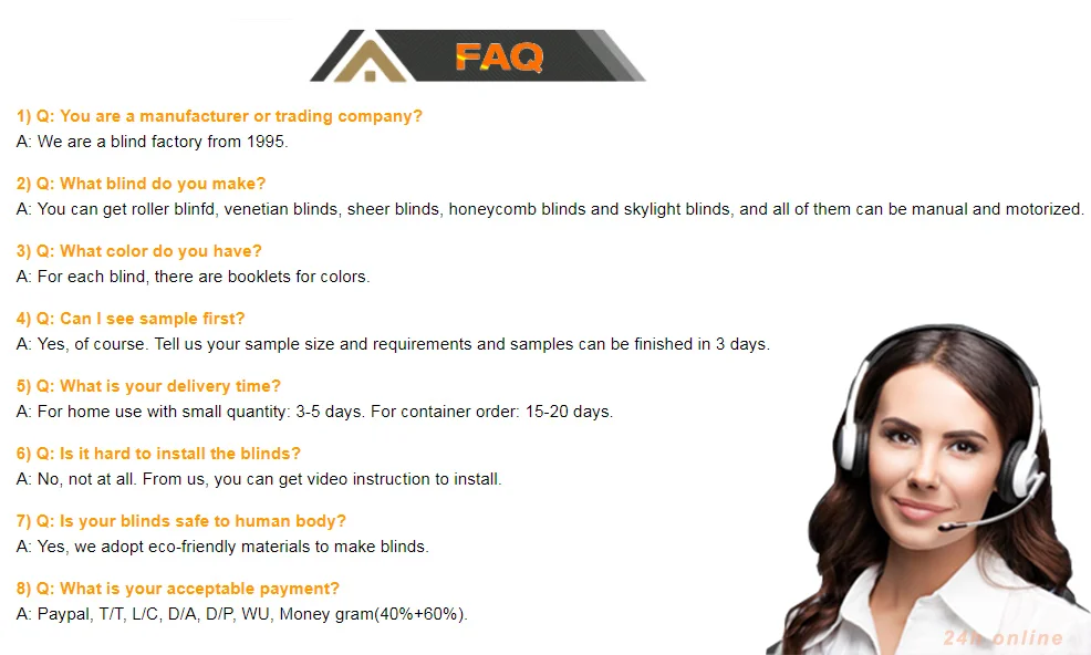 7:The company's products include: honeycomb blinds, zebra/rainbow blinds, roller blinds, sunshine fabric, curtain, wooden blinds,fabric blinds, aluminum blinds, Roman blinds, etc | ||||||||