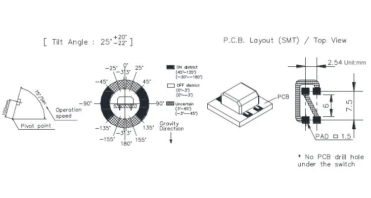 25° Tilt detecting for 4 directions in horizontal position