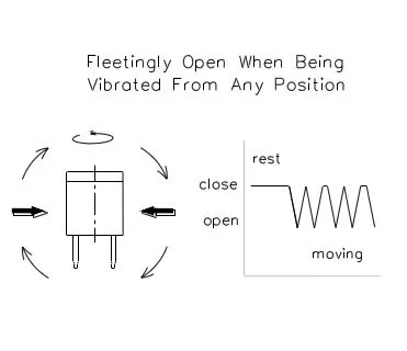 Description: Ball-ContactThe VBS061110 acts like a normally closed switch which chatters open and closed as it is tilted or vibrated. Note that the VBS061110 is not guaranteed to be closed --- occasionally the sensing mechanism may remain open when at rest. The engineer should design his or her software to look for high-to-low and low-to-high edge transitions rather than an open or closed state of the switch.