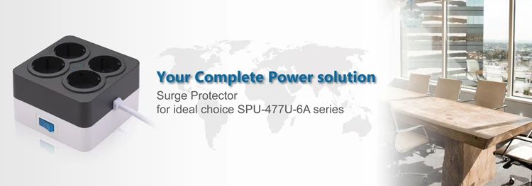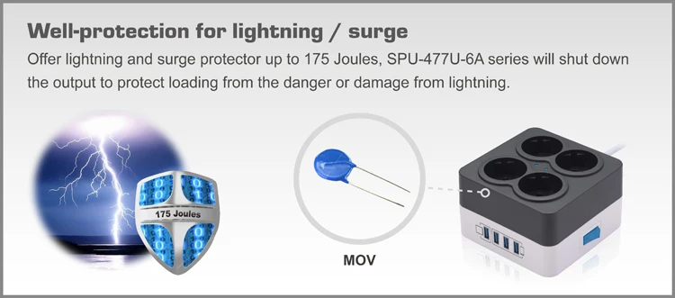 Offer lightning and surge protector up to 175 Joules, SPU-477U-6A series will shut down the output to protect loading from the danger or damage from lightning. surge protector USB charge