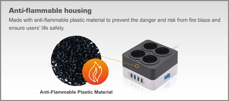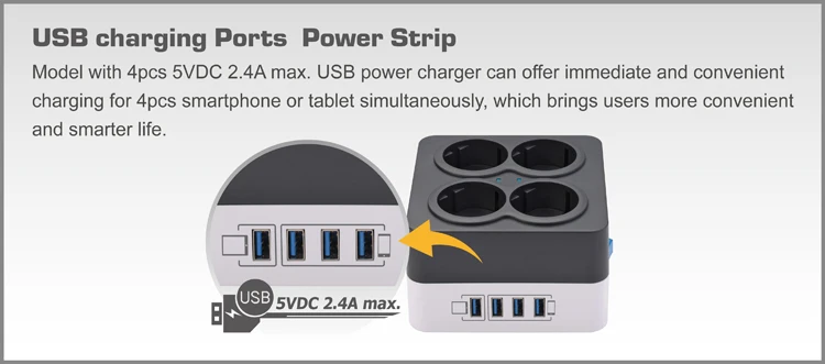 Model with 4pcs 5VDC 2.4A max. USB power charger can offer immediate and convenient charging for 4pcs smartphone or tablet simultaneously, which brings users more convenient and smarter life. German surge extension socket