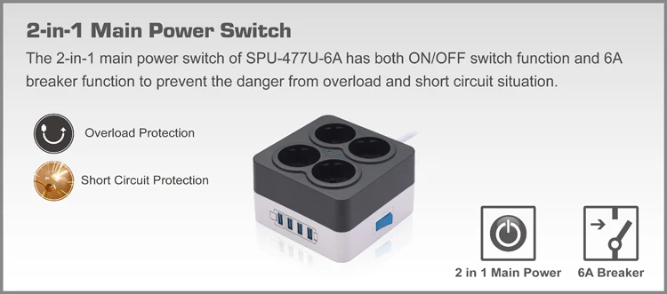 The 2-in-1 main power switch of SPU-477U-6A has both ON/OFF switch function and 6A breaker function to prevent the danger from overload and short circuit situation. surge protector USB charge