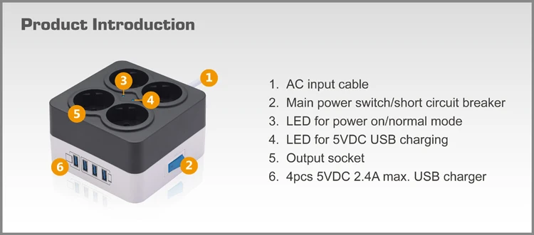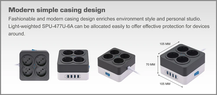 SPU-477U-6A series is smart surge protector with 4 receptacles German . Built-in 175 Joules surge and lightning protection and 6A circuit breaker offer complete power protection from voltage spike, short circuit and overload. Equipped with 4 pcs 5VDC 2.4A max. USB power charger can charge smartphone, GPS, and tablet or other personal devices simultaneously. Fashionable simple casing design satisfies the concise concept of modern life style. Schuko surge protector