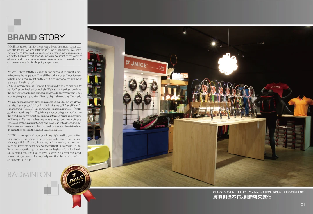 JNICE was founded in 2011 by our CEO Mr. Bruce Lee. With the professional knowledge and the passion of badminton, Mr. Lee endeavored to build a Taiwan made badminton brand with unique characteristics and the highest quality.