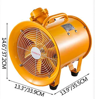 * 【10" EXPLOSION PROOF FAN】- EX rated explosion proof fan is designed with an explosion proof switch. Static: 350Pa. Fan Diameter: 10"(250mm), perfect connect to anti static flexible air duct hose in 10". * 【HIGH PERFORMANCE MOTOR】- Axial blower features 350W explosion proof motor with high speed: 3450Rpm fit long time ventilation work, low noise 66dB(A). Reliable and built to last. * 【PORTABLE & COMPACT】- Tough steel boxed frame to be portable. Product Size: 13.78" x 13.38" x 14.96"(35 x 34 x 38cm) for easy use and storage. * 【LARGE AIR FLOW】- High output fans designed with strong suction. Diameter: 10"(250mm) and 6 thick blades offer large Capacity: 55m3/min. Two durable grills bring the fan's continuous working safely and cleanly. * 【EASILY MOVEABLE】- For a long term stable standing, 4 rubber feet at the bottom are offered, besides, another 2 rubber feet are free for easy replacement. Ideal for ventilation in panelbeating, chemical and metallurgy industries.