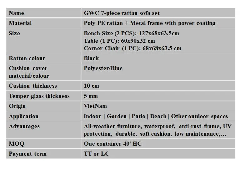 With the modern and luxury appearance, our all-weather 7-piece rattan sofa set will be an elegant touch of class to your spaces. The main material is high-quality PE rattan which is waterproof, UV-protection, and has strong toughness, it requires low maintenance throughout the use process. The steel frame enhances the durability of this set made it superior load-bearing, we cover its frame by anti-rust power coating. If you are seeking a money-saving solution, our sofa set is the right choice since it can be used in the longterm.