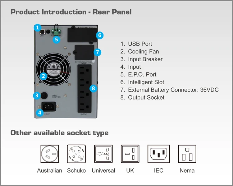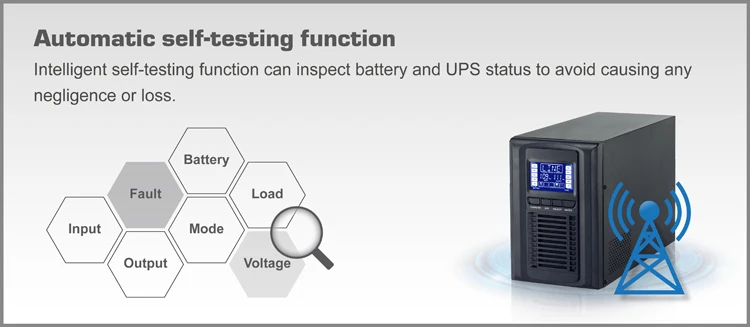 Intelligent self-testing function can inspect battery and UPS status to avoid causing any negligence or loss. online UPS
