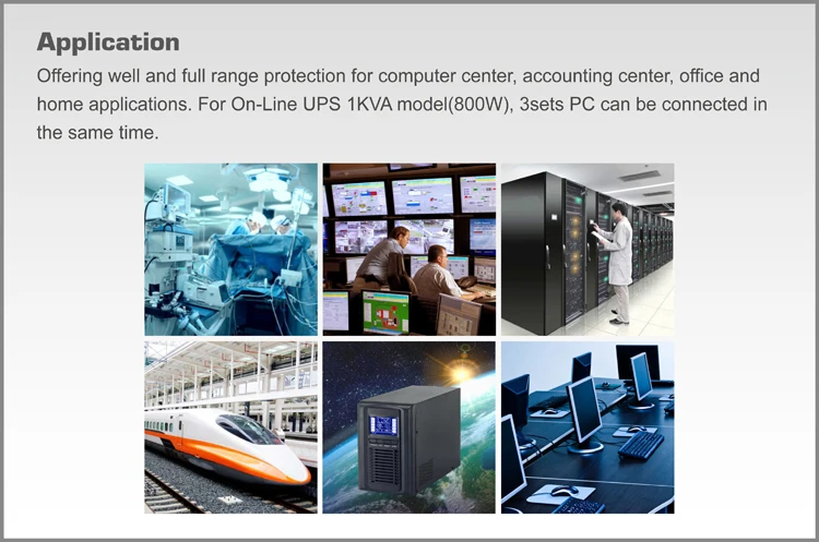Offering well and full range protection for computer center, accounting center, office and home applications. For Online UPS 1KVA model(800W), 3sets PC can be connected in the same time. Power supply Online UPS 1000VA