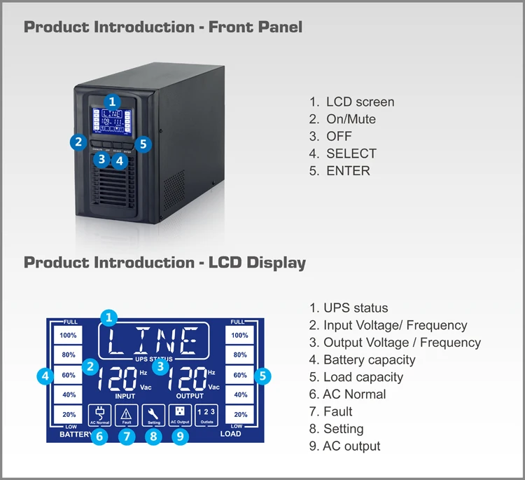 UPS system works by converting power from AC to DC and then back to AC. Supplying power with zero transfer time to the battery to ensure uninterrupted back-up power when AC power is abnormal, make it ideal for any sensitive devices.