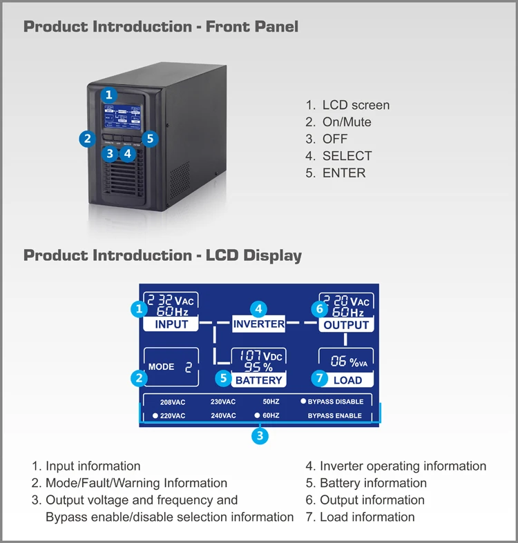 LCD Display | Input, Output, Load, Battery, Mode/Fault/Warning code, Inverter operating, Bypass operating, Output voltage and frequency and Bypass disable / enable selection information | |||||