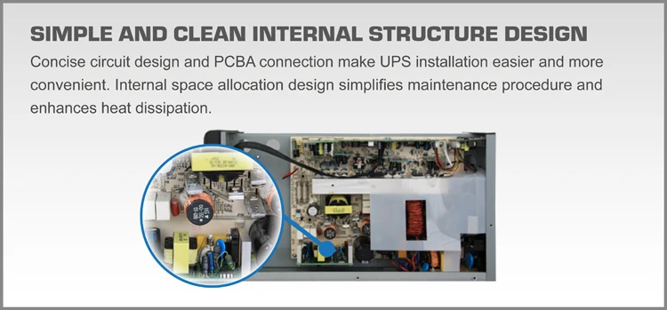 Concise circuit design and PCBA connection make UPS installation easier and more convenient. Internal space allocation design simplifies maintenance procedure and enhances heat dissipation. HV Online UPS 1KVA