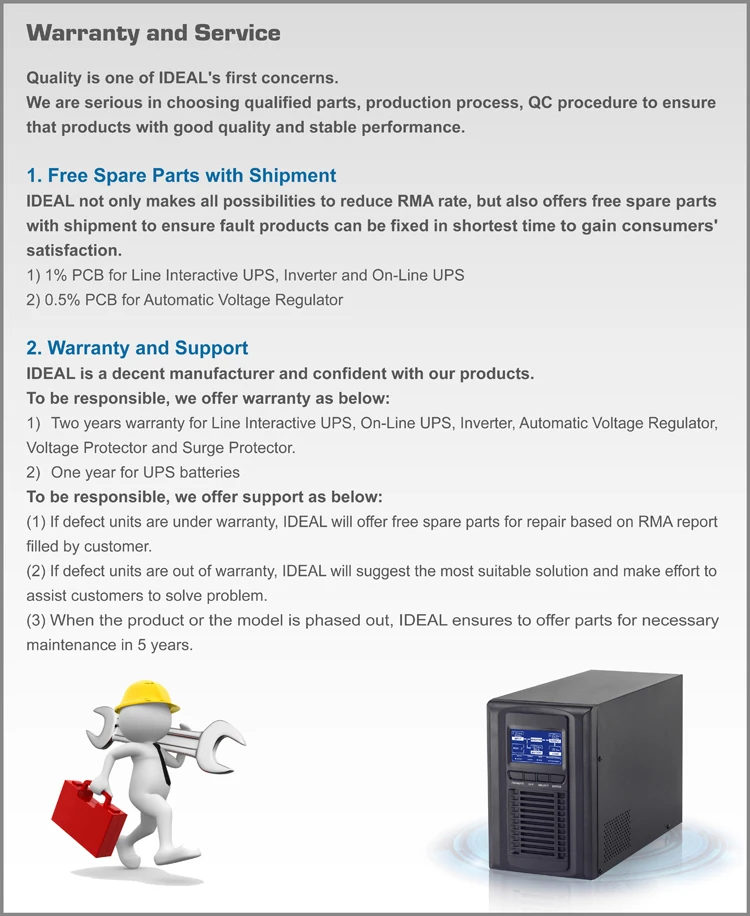 IDEAL POWER CO., LTD was founded in 1996 and committed to design and manufacture reliable and qualified full range of power products, including Uninterruptible Power Supply (UPS), Inverter, Automatic Voltage Regulator (AVR), Voltage Protector (VP) and Surge Protector (SP).