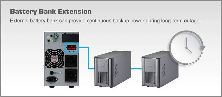 External battery bank can provide continuous backup power during long-term outage. HV Online UPS 1KVA