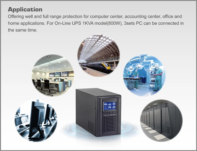 Offering well and full range protection for computer center, accounting center, office and home applications. For Online UPS 1KVA model(800W), 3sets PC can be connected in the same time. Online UPS