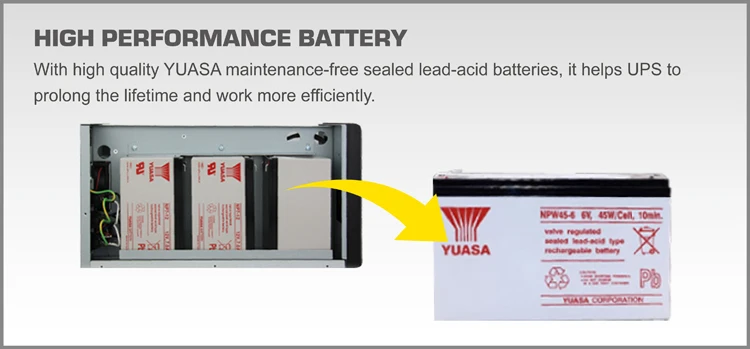 With high quality YUASA maintenance-free sealed lead-acid batteries, it helps UPS to prolong the lifetime and work more efficiently.
