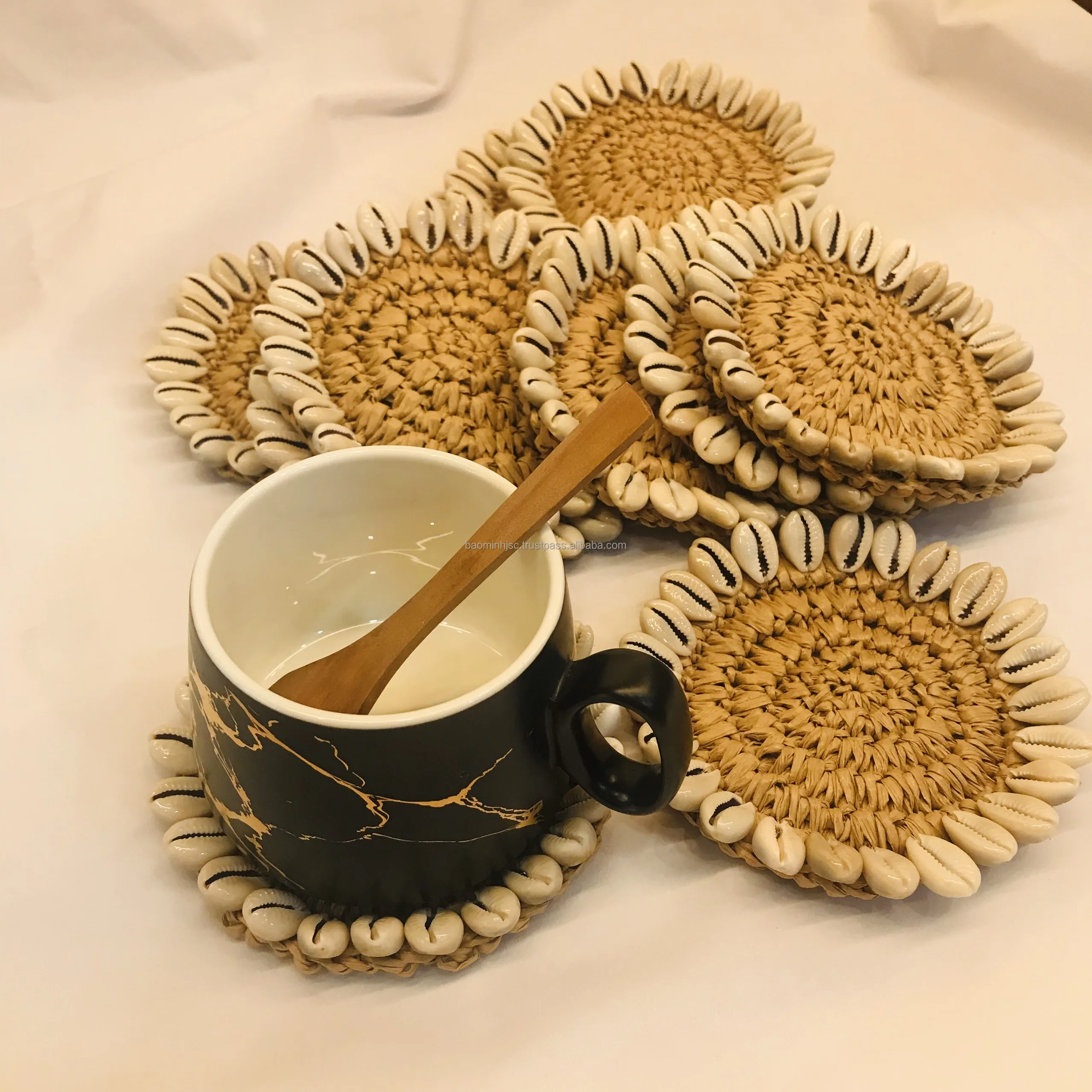 Item Description | Coasters with seashells fringes. This product is a paper raffia coaster with seashells fringe. It is so elegant and will bright your table decoration. It is a true coaster with the paper raffia part inside keep your cup safe. We can do this design in some sizes, please contact our sale agent to update the latest price and get it yours today! | ||||