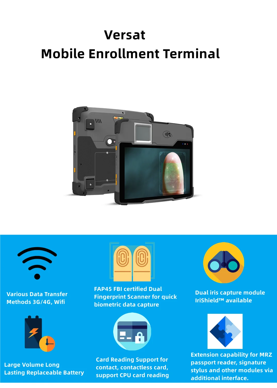 The mobile enrollment terminal Versat is designed for bring the quick, accurate biometric registration process into compact size.Equipped with various high quality biometric and identity modules like dual FP scanner, iris scanner, smart card reader, Versat can be easily applied to various project application like voter registration, national identity registration and issuing, border control, security control and bring full range enrollment capability in a compact size.