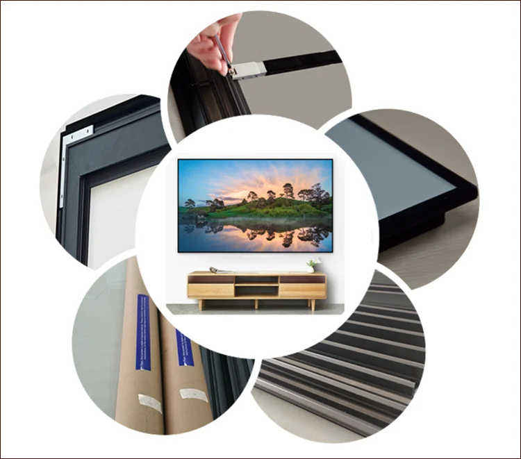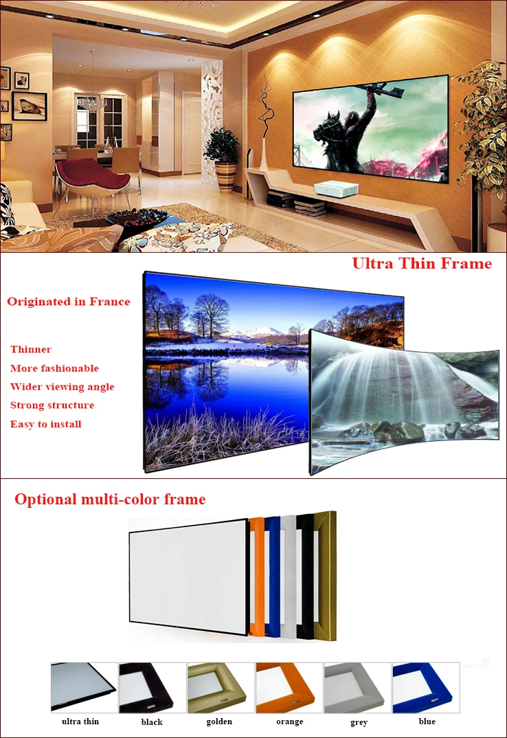 Ultra Thin Frame Projection Screen uses sturdy extruded aluminum alloy frame with 12mm edge border, which offers maximized viewing, its appearance becomes more delicate, visual effect becomes more eye-catching, and warmly welcomed at home theater and commercial places.