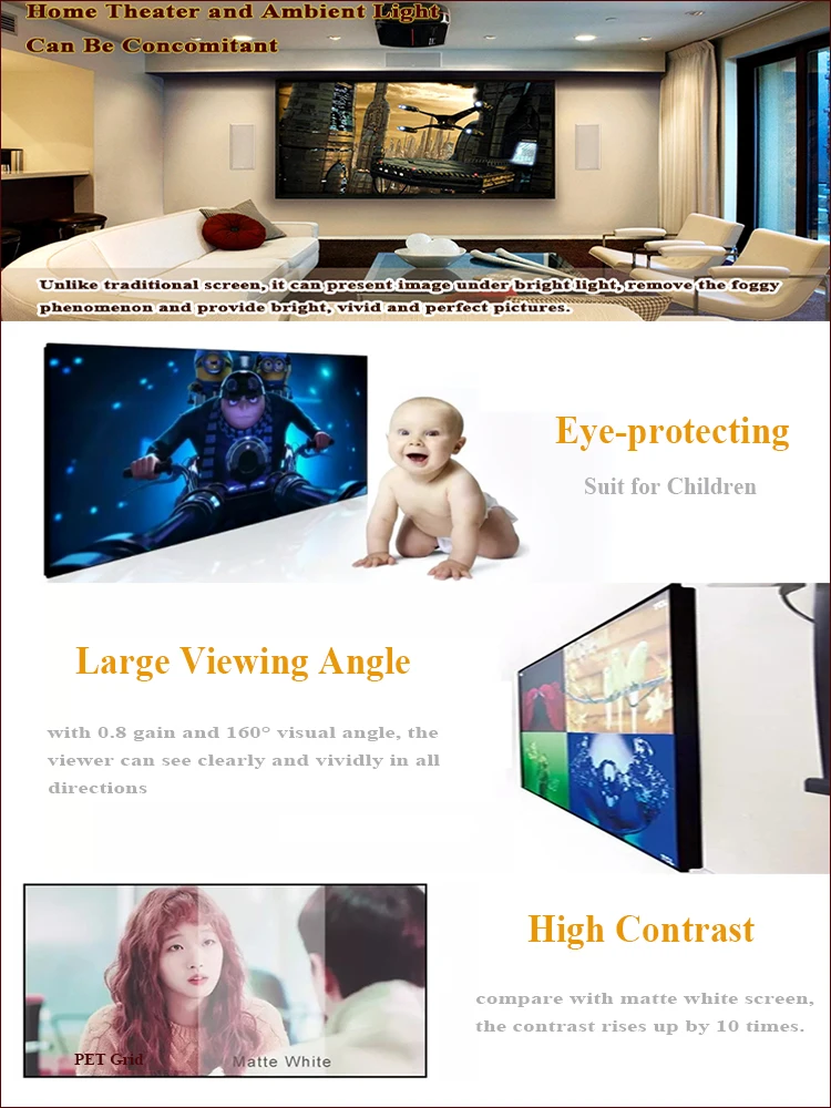 In order to popularize the ultra short throw projection screen, XY Screens developed this cost effective screen, PET Grid. This fabric has some tiny grids on the surface, which can absorb ambient light.