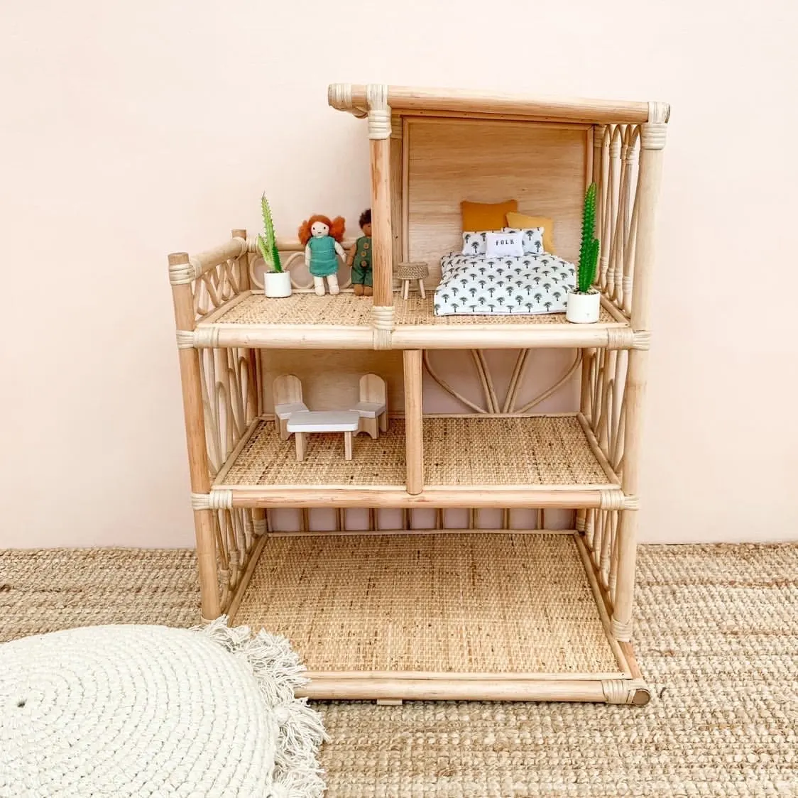 A very fine rattan doll house for every child to craft their own imaginary world. This charming two-story, mid-century dollhouse adds minimalist charm to any play space. Four open rooms are ready for furnishing fun, encourage independent play, and spur creativity and design. Our rattan doll house is designed and handcrafted with love. Due to the natural materials and hours of craftsmanship, these timeless products sometimes have slight imperfections and can vary in colour consistency due to the natural rattan. This makes our products more unique and one of a kind.