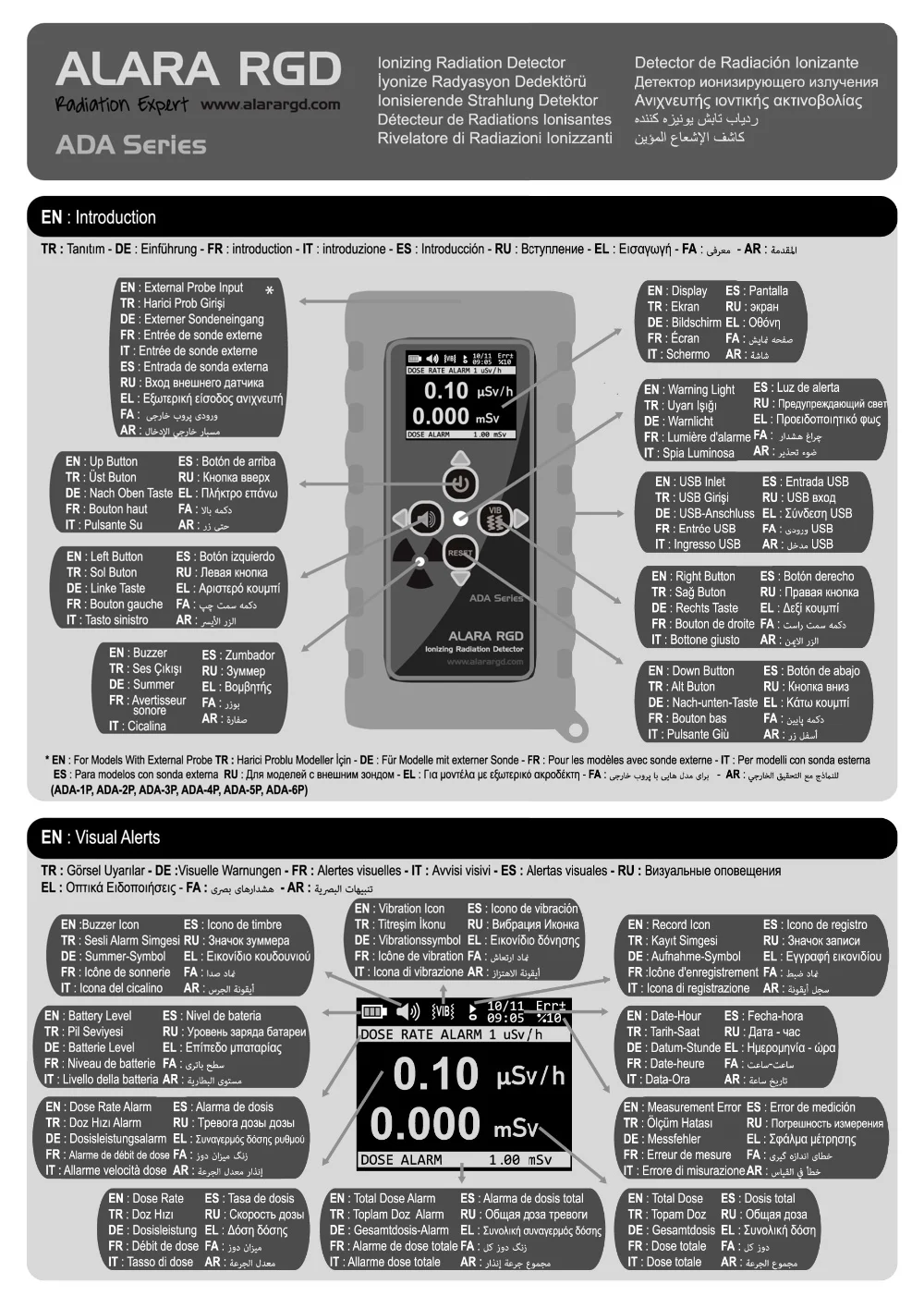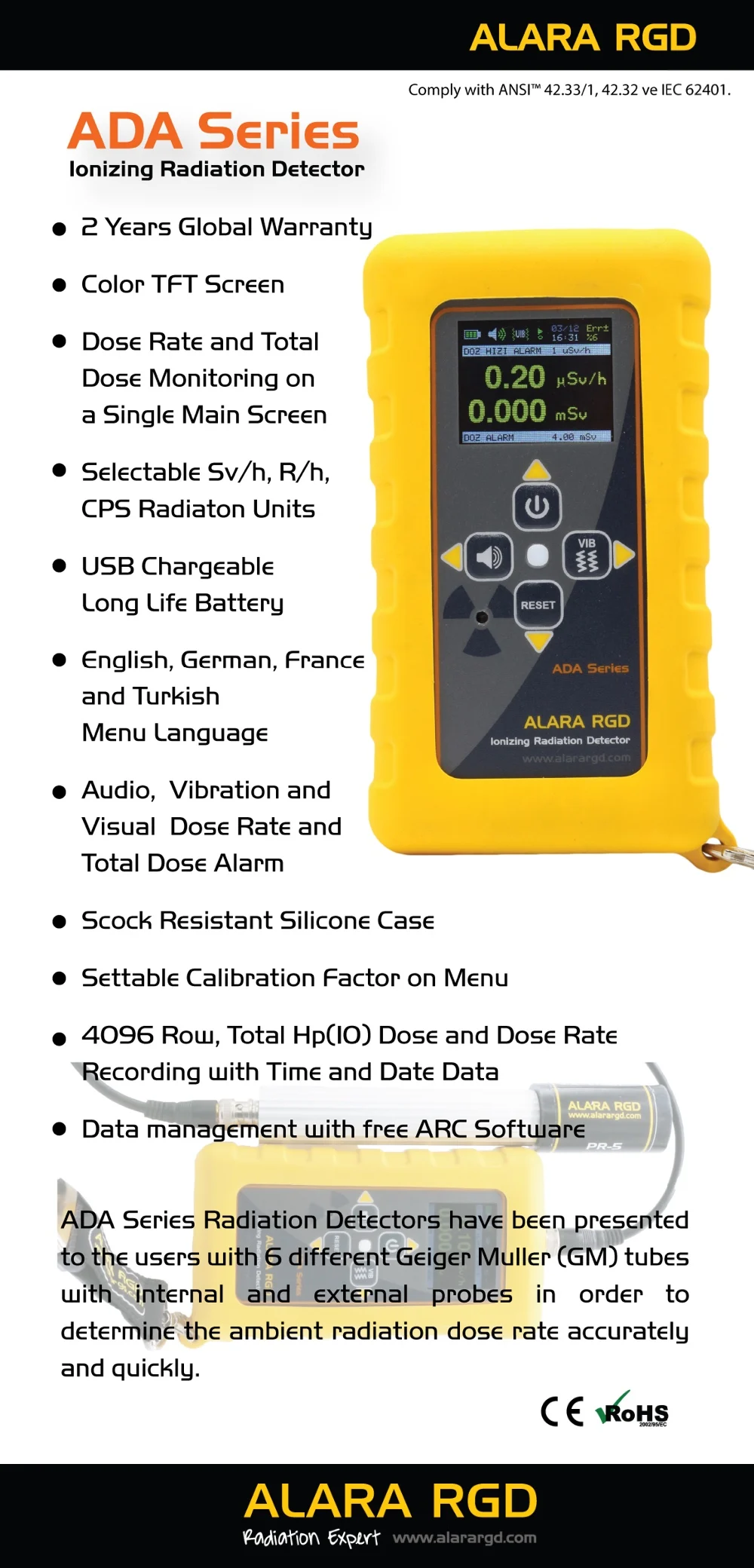 ADA Series Radiation Detectors have been presented to the users with 6 different Geiger Muller (GM) tubes with internal and external probes in order to determine the ambient radiation dose rate accurately and quickly.