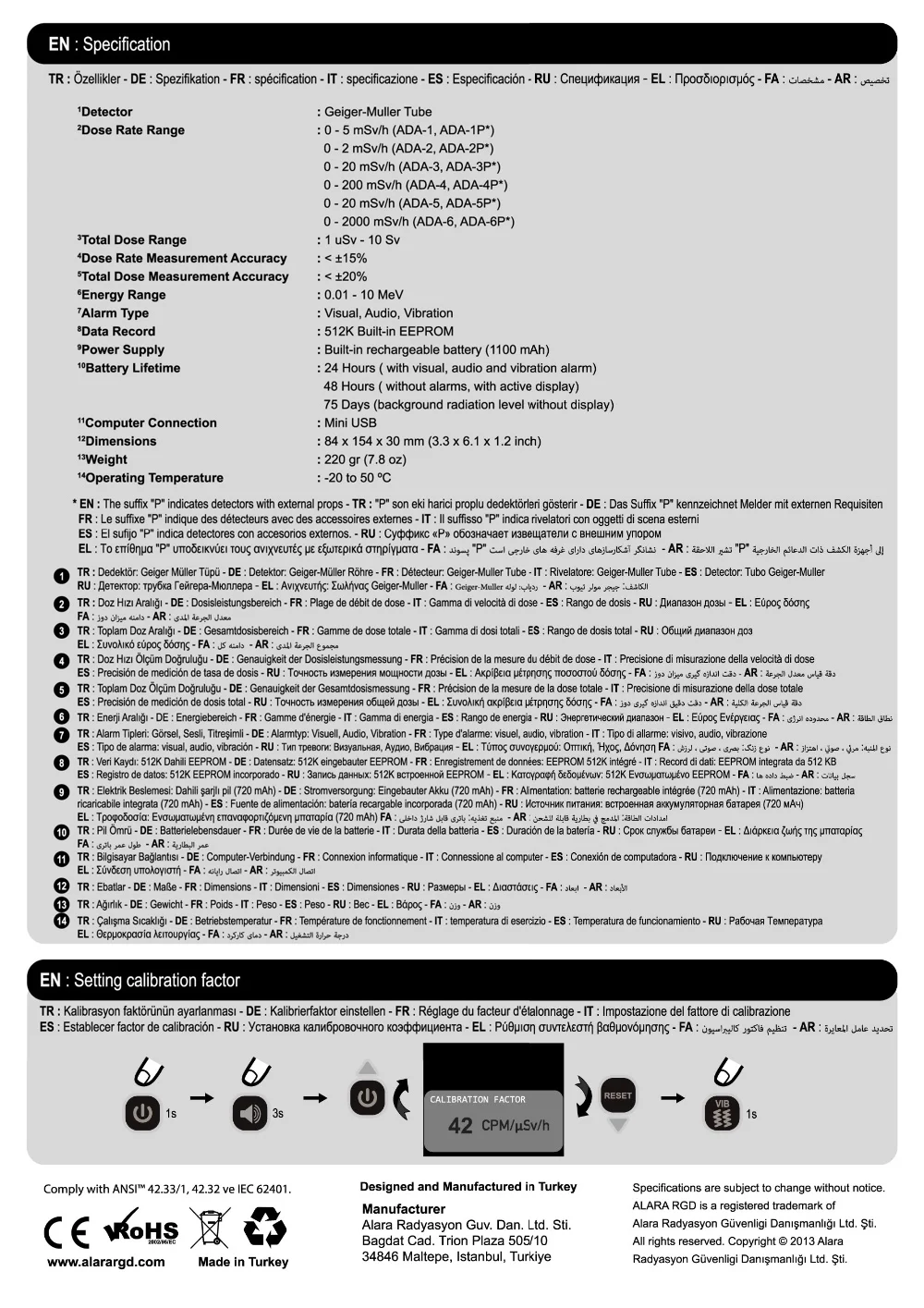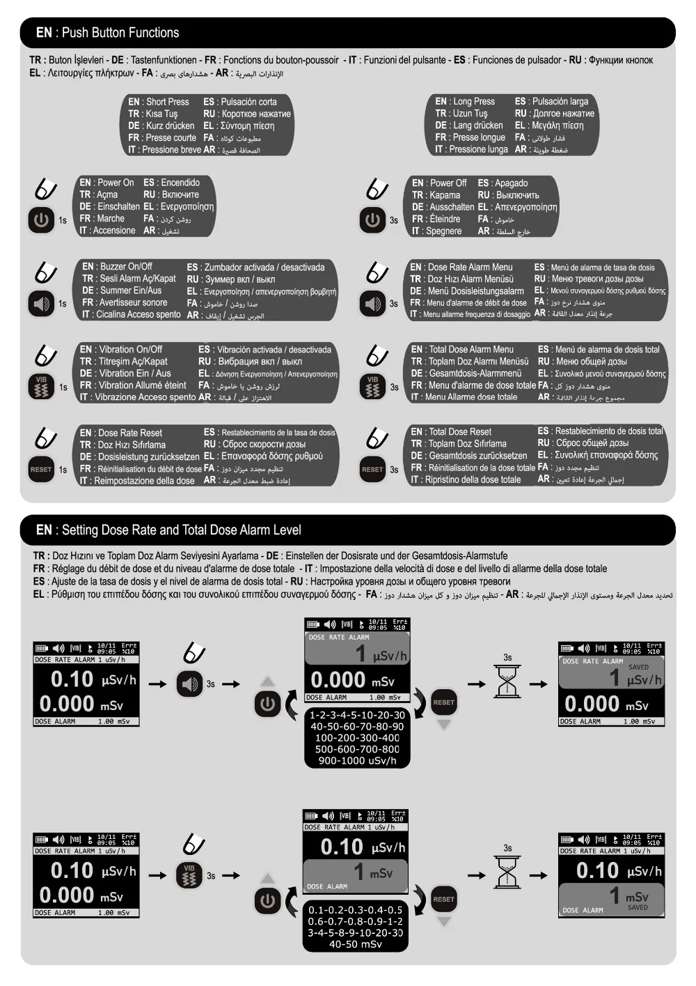 * Audio, Vibrating and Visual Dose and Dose Rate Alarm