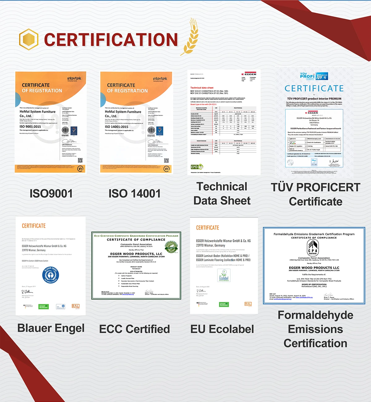 A3 : HeMai insists on choosing Sustainable and Eco-friendly products complied E1P3 European standard, and American Carb2 standard.