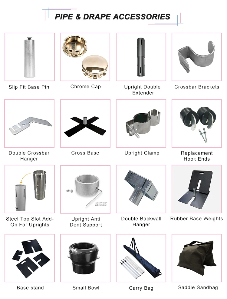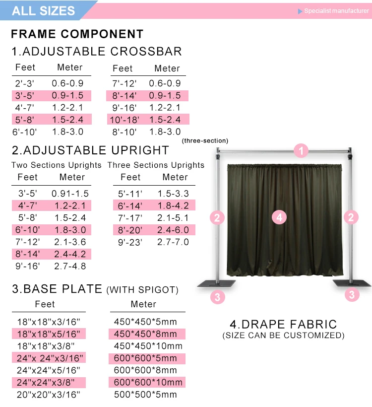 Crossbar (drape rod) | 2'-3', 3'-5', 4'-7', 5'-8', 6'-10', 7'-12', 8'-14', 9'-16', 11'-20', 12'-22', 13'-24', 14'-26' |